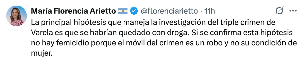 Las tres características, no una, las tres, ocurrieron en el caso de Lara, Brenda y Morena. ¿Algo más necesitará la abogada Florencia Arietto para comprender que, de comprobarse lo que hasta ahora se ha comentado, estamos ante un triple femicidio? ¿Los narcos también son violentos con los varones? Ah, mirá, no sabíamos. Nos acabamos de enterar. Entonces vamos a eliminar los contextos de narcotráfico como posibles escenarios de femicidios. Es más, vamos a reformar todos los protocolos nacionales e internacionales del mundo para establecer que si el autor es narco, no es femicidio.