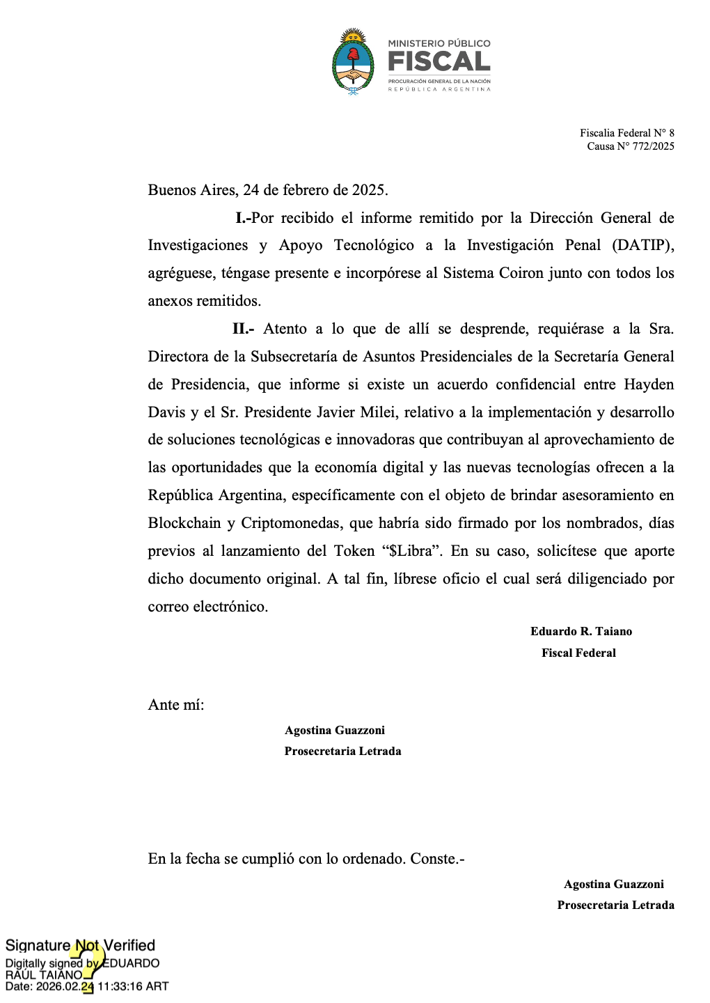 Pero si: (a) Milei firmó un convenio con Davis (como refiere el periodista Mariano Vidal); (b) Davis le pagaba a unos tipos con los que Milei hacía negocios desde hacía muchos años y a uno de los cuales directamente empleó en la CNV; (c) Davis y los empresarios se reunieron con Milei en Casa Rosada al día siguiente de la fecha de aquel convenio; (d) los empresarios entraron 10 veces a Casa Rosada y 4 a Olivos (adonde sólo reside Milei); (e) hay conversaciones por WhatsApp e Instagram de Milei y su hermana con los empresarios; (f) hay múltiples testigos de que Karina Milei y otros personajes pedían dinero para reunirse con Milei; y (g) Milei casualmente ayudó con su famoso tweet del 14 de febrero a que los impulsores de $LIBRA se hicieran de alrededor de USD 300 millones de dólares, ¿no sería bueno hacerle un par de preguntas? ¿Por qué Taiano no tomó ninguna medida? ¿Por qué ni siquiera requiere la instrucción? ¿Por qué todavía no citó como testigo a Mariano Vidal, el periodista de Clarín que desde el 22 de diciembre del año pasado sostiene que el acuerdo Milei-Davis se firmó?