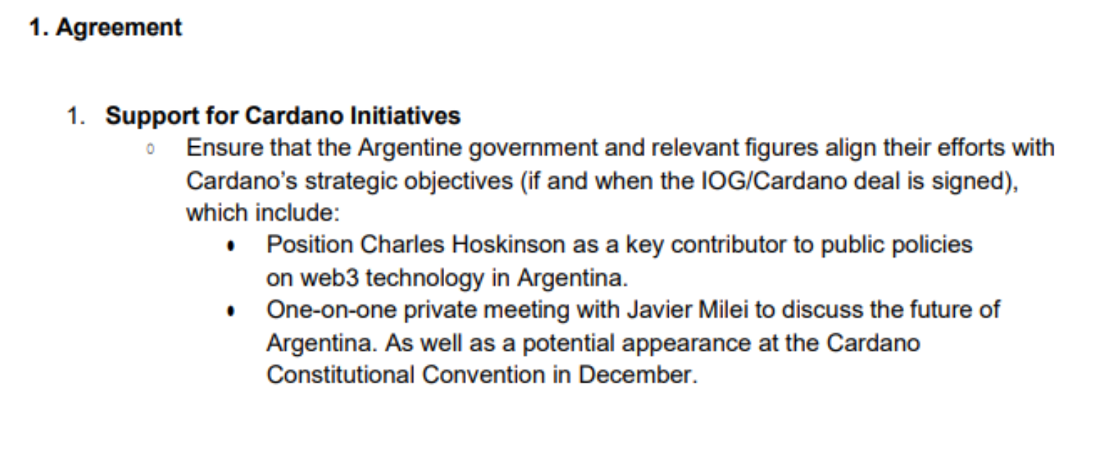 Pocos días después, el 27 de noviembre, se conforma un contrato consistente con esa oferta irrevocable, ahora en inglés, entre otro vehículo corporativo de Davis (la BVI Kelsier Holdings Limited) y el mismo grupo de empresarios locales (Novelli, Terrones Godoy y Morales) por montos similares a los ya mencionados y con el objeto de apoyar a la firma Cardano de Charles Hoskinson, incluyendo "reuniones privadas uno a uno con Javier Milei" y su "potencial aparición" en una convención de la empresa. Recordemos que, luego de que estalló el escándalo de la criptoestafa $LIBRA, Hoskinson denunció públicamente que, en el contexto del Tech Forum del 19 de octubre, Novelli y Terrones Godoy le habían pedido dinero para destrabar una reunión privada con Milei. Ya el New York Times había revelado ese tipo de pagos por reuniones con el Presidente en una nota de febrero de 2025.
