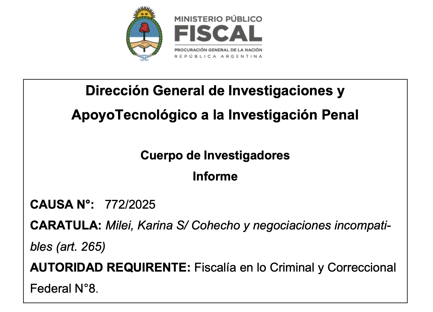 Se ve que Taiano no sabe que Karina Milei encabeza la carátula de la causa cuya investigación tiene el altísimo honor de conducir en los términos del art. 120 de la Constitución Nacional. "Milei, Karina s/cohecho y negociaciones incompatibles (art. 265)". Así se caratula el expediente N°772/2025 conocido como $LIBRA, chicos.